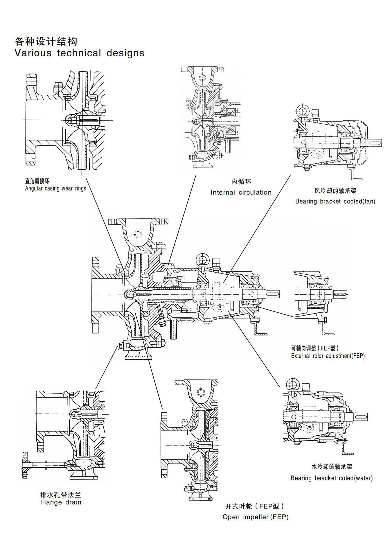 根据使用条件,采用前、后磨损环及平衡孔进行水力平衡。 填料箱具有冷却或加热管接头。 轴封采用填料密封,也可以采用单端面或双端面机械密封。并配有冷却冲洗或密封系统。