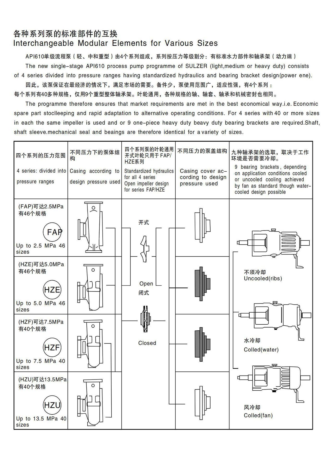 该系列泵为石油化工流程泵,是根据API610规范设计的。该泵为单级、卧式径向剖分蜗壳泵,泵体为脚支撑。单吸径向叶轮,轴向吸入,径向排出。根据使用条件,采用前、后磨损环及平衡孔进行水力平衡。填料箱具有冷却或加热管接头。轴封采用集装式单端面或双端面密封。并配有冷却冲洗 或密封系统。密封管路按API规范设计。吸入及排出管法兰的额定压力等级相同。从电机端看,泵为顺时针转动。